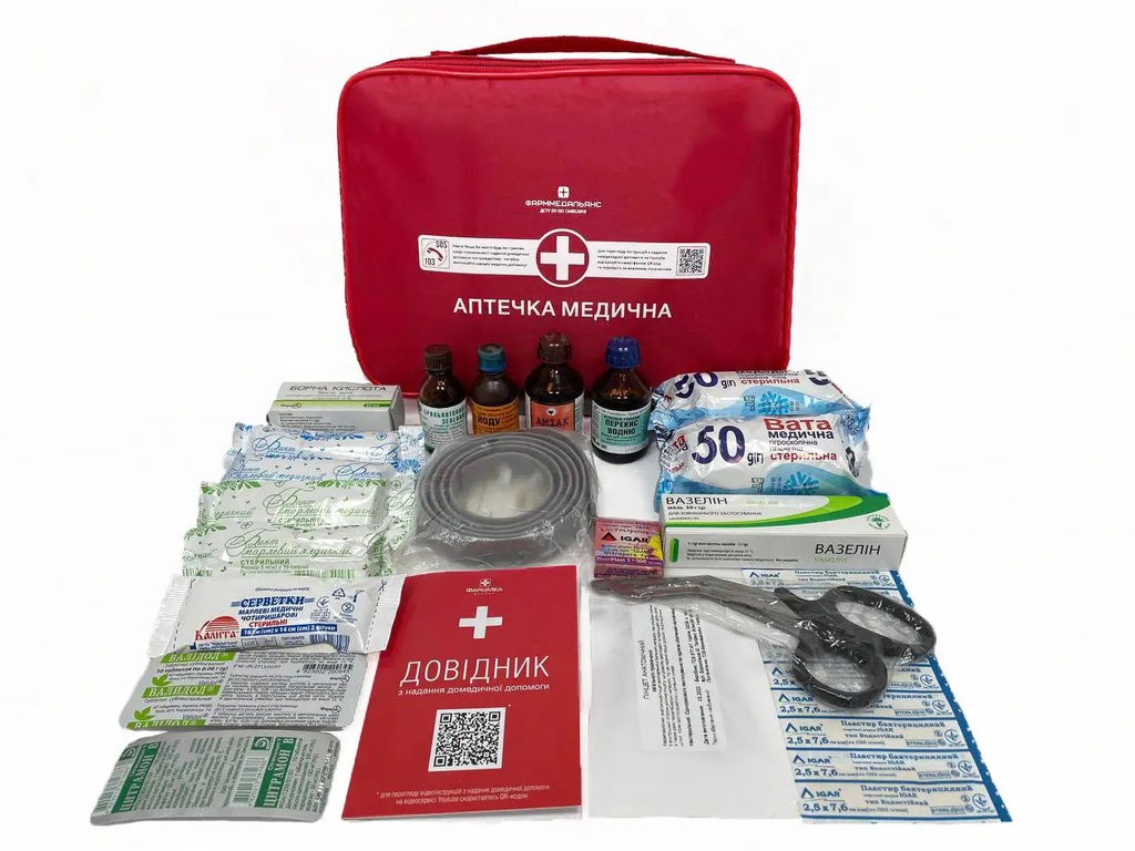 Аптечка содержит изделия для обработки и перевязки ран, антисептические, обезболивающие, сердечные и вспомогательные средства, а также справочник по оказанию первой помощи и рекомендации по применению вложений.