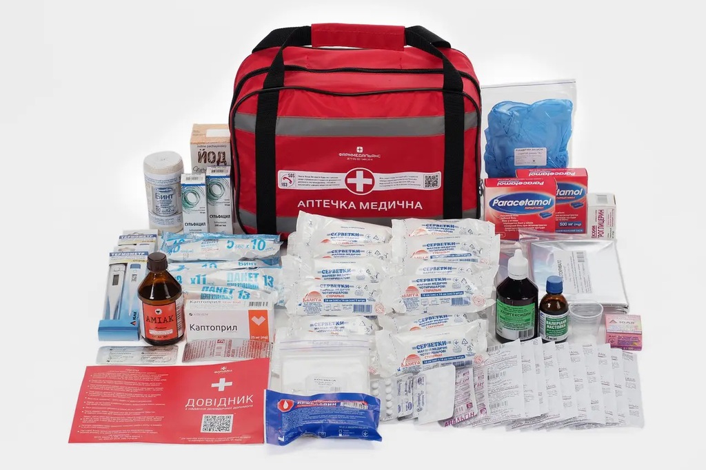 Аптечка содержит изделия для обработки и перевязки ран, сердечные, антисептические, жаропонижающие средства, средства при отравлениях, заболеваниях ротовой полости, вспомогательные средства, справочник по оказанию первой помощи и рекомендации по использованию вложений.