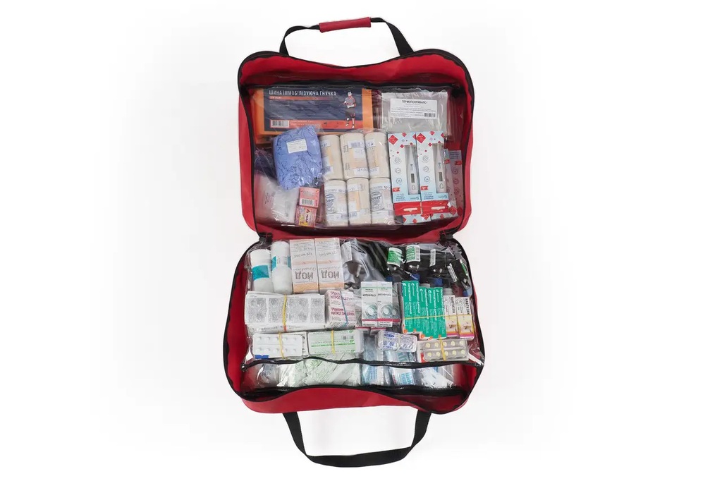 Аптечка содержит изделия для обработки и перевязки ран, сердечные, антисептические, жаропонижающие средства, средства при отравлениях, заболеваниях ротовой полости, вспомогательные средства, справочник по оказанию первой помощи и рекомендации по использованию вложений.