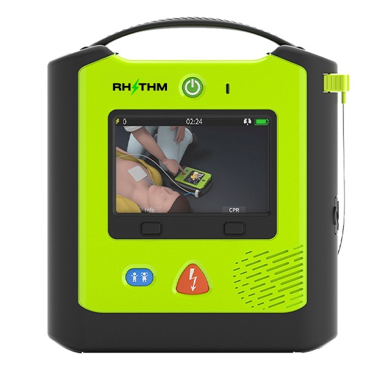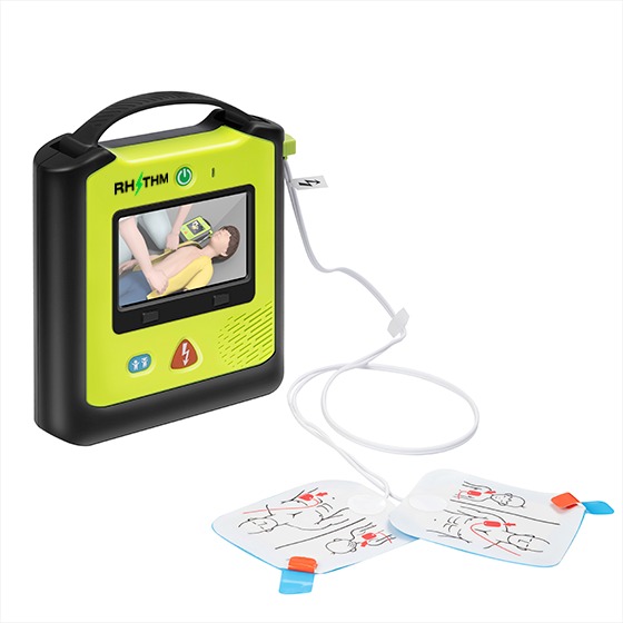 "RHYTHM" AEDX3 - сверхсовременный автоматический дефибриллятор с дисплеем, двумя кнопками управления, взрослым и детским режимами, USB-портом и ярким цветом.