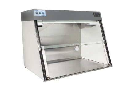 Настольная модель для стерильных работ, изготовлена: столешница и задняя стенка из нержавеющей стали, боковые стенки HPL пластик, защитный экран - стекло с УФ-защитным покрытием.