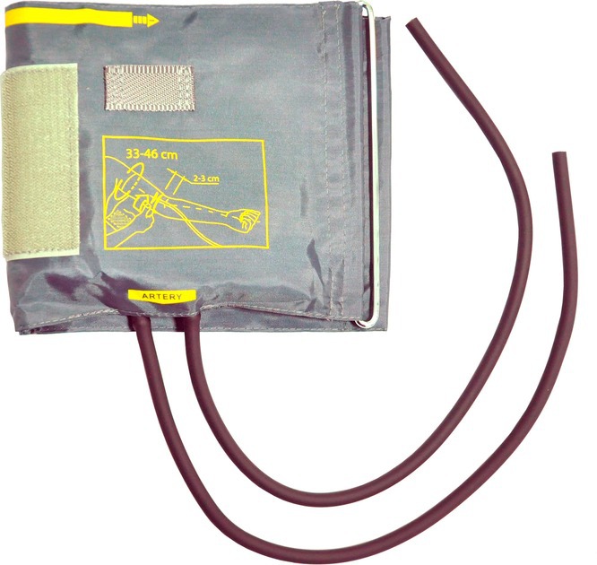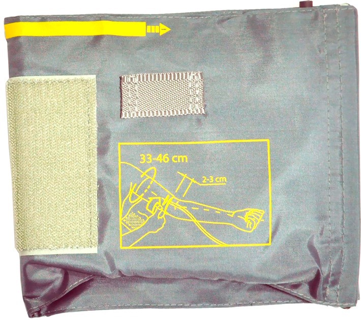 Манжета состоит из пневмокамеры и нейлонового покрытия. Предназначена для руки с окружностью плеча от 33 до 46 см.