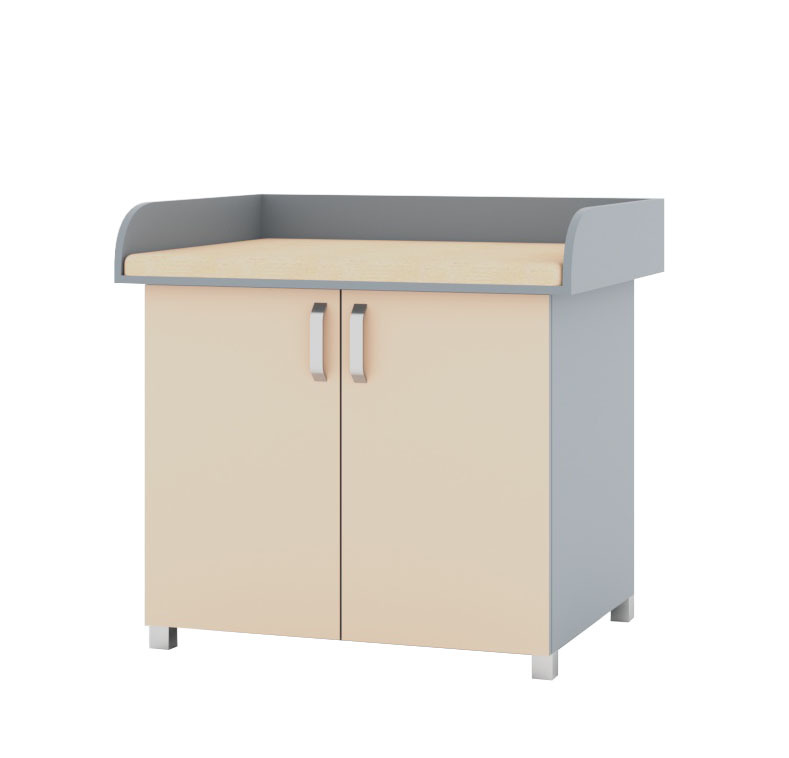 Корпус тумбы и столешница пеленального стола изготавливается из ламинированного ДСП, цвет которых может быть выбран заказчиком. Торцы столешницы и фасада обработаны ударопрочной кромкой из ABS – пластика толщиной 2 мм. Внутри тумбы расположена полка для удобного размещения и хранения расходных материалов, предназначенных для ухода за младенцем. Тумба установлена на металлические опоры с регулировкой по высоте, что облегчает ежедневную гигиеническую обработку помещения. Матрас выполнен из пенополиуретана с покрытием из высококачественной искусственной кожи, цвет которой может быть выбран заказчиком.