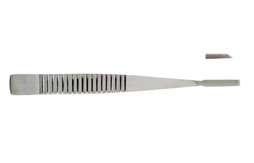 Долото по Partsch, с рифленой ручкой, плоское. Для долбления и рассечения костей, сдалбливания костных масс по поверхности, удаления костных новообразований и загрязнений кости при открытых переломах, вскрытия полостей в трубчатых костях.