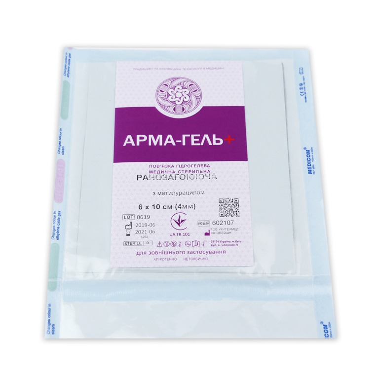 Повязки гидрогелевые «Арма-гель +» (с метилурацилом) используются как антибактериальное, противовоспалительное, ранозаживляющее средство. Стимулирует процесс регенерации, используется для заживления чистых, вялозаживающих, гранулирующих ран.