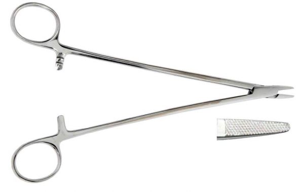 Иглодержатель, 160 мм. Инструмент предназначен для удержания и проведения через ткани хирургических игл при наложении шва.