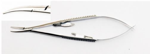 Иглодержатель глазной по Кастровьеджо, изогнутый. С зубцами и фиксатором. Длина 140 мм. Предназначен для удержания хирургических игл при наложении шва.