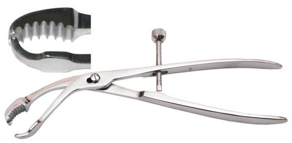 Костодержатель изогнутый (рабочая часть 30 мм). Костодержатель предназначен для удержания костей при остеосинтезе переломов. Длина 260 мм, длина рабочей части 30 мм.
