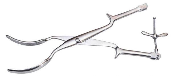 Краниокласт по Kielland-luikart. Длина 400 мм, длина рабочей части 100 мм, ширина 25 мм. Инструмент захватывает и вытягивает части черепа ребенка после разрушения.