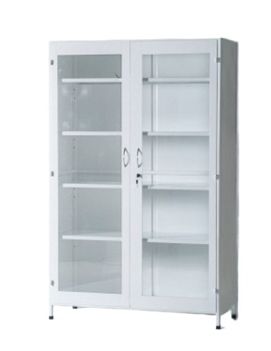 Каркас шкафа изготовлен из листовой стали, окрашенной антибактериальной полимерной краской. Шкаф оснащён двумя стеклянными дверцами в металлическом профиле с замком.
