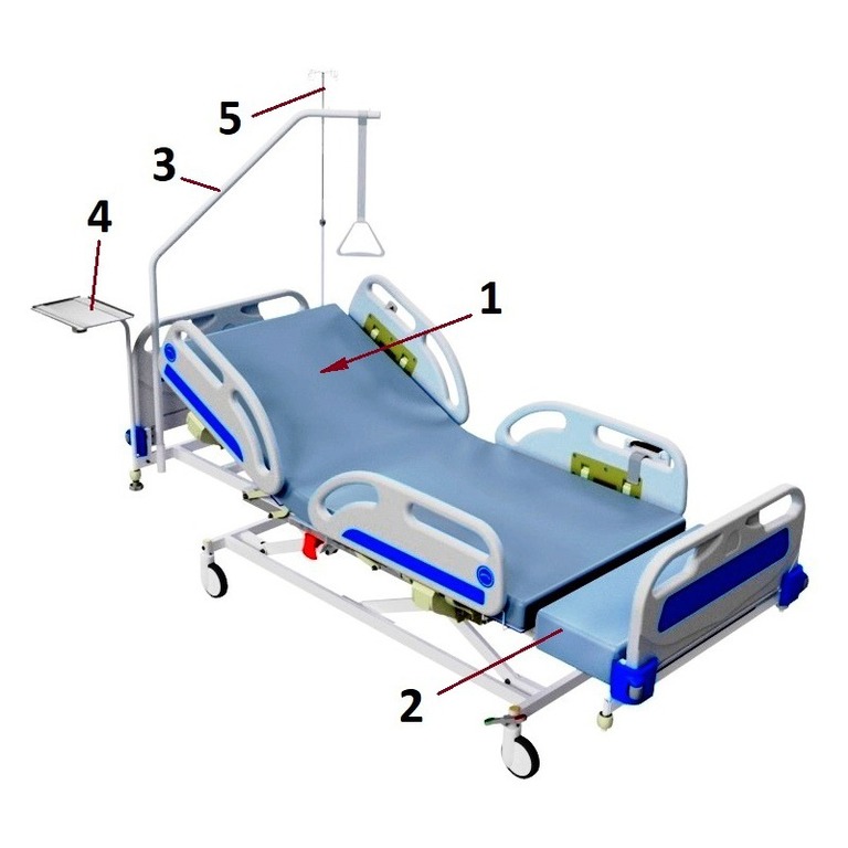 Комплектация матрасом, надкроватной трапецией, столиком для приборов, инфузионной стойкой
