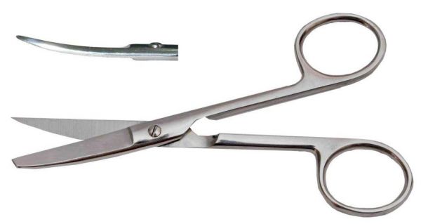 Ножницы с одним острым концом, изогнутые, 140 мм. Для разрезания мягких тканей, главным образом тогда, когда для разреза, вначале надо проколоть ткань.