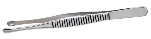 Пинцет зубчатолапчатый 150 мм, ширина 6 мм. Для удерживания плотных тканей (сухожилий; кожи), а также игл, лигатур (с подковообразно расположенными на рабочей части).