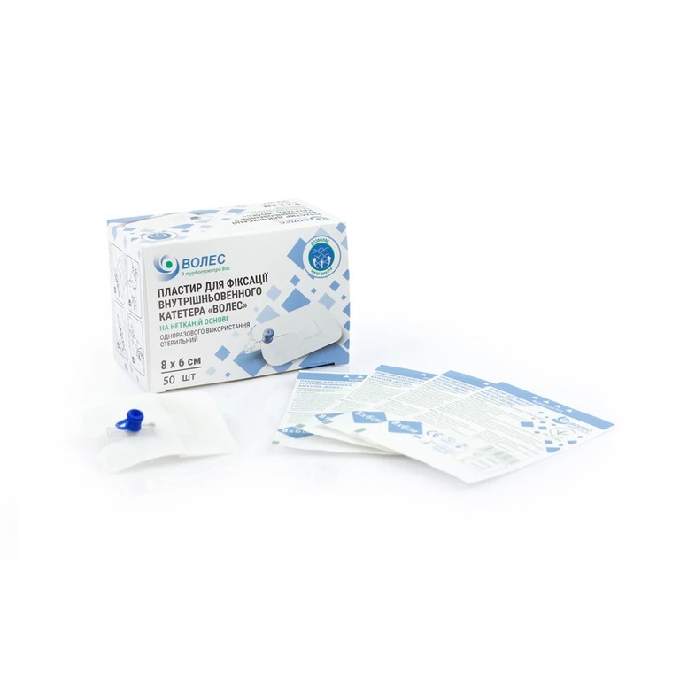 Бактерицидний пластир "ВОЛЕС" має неткану основу білого кольору, розміром 8 × 6 см. Спеціальна U-подібна форма забезпечує надійну фіксацію кактетера.