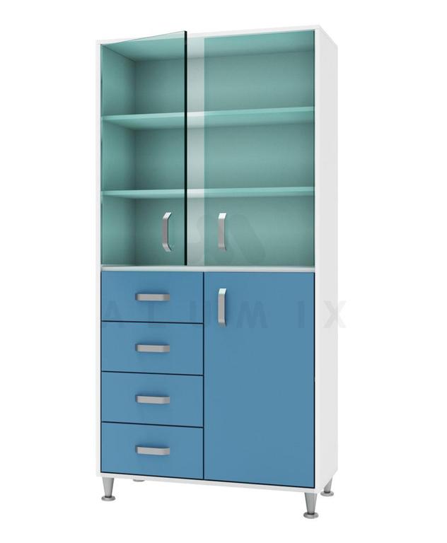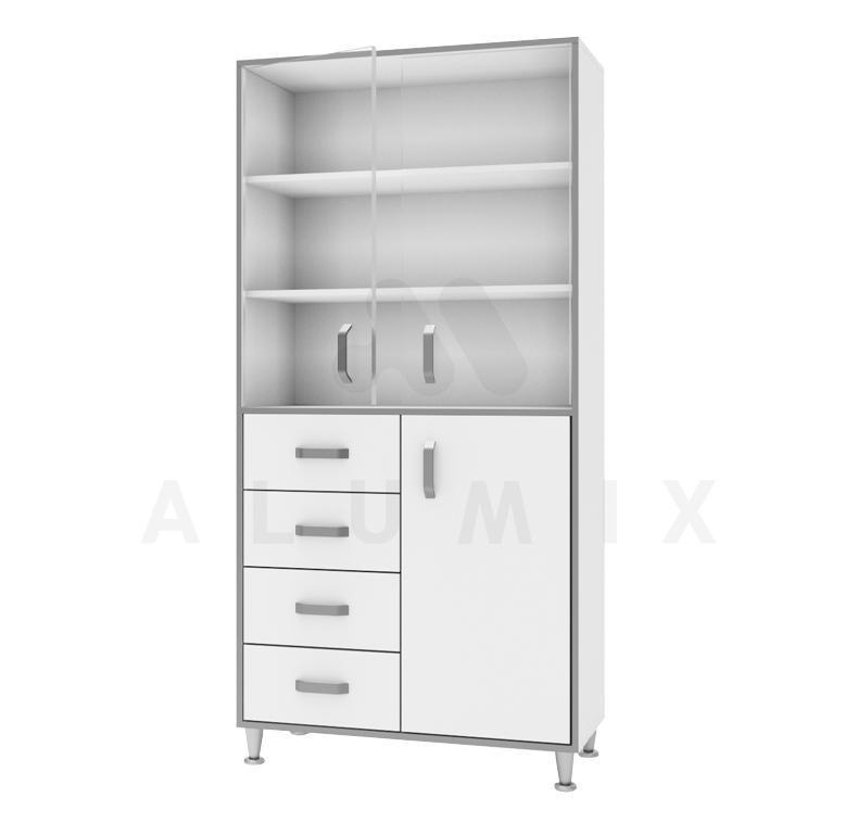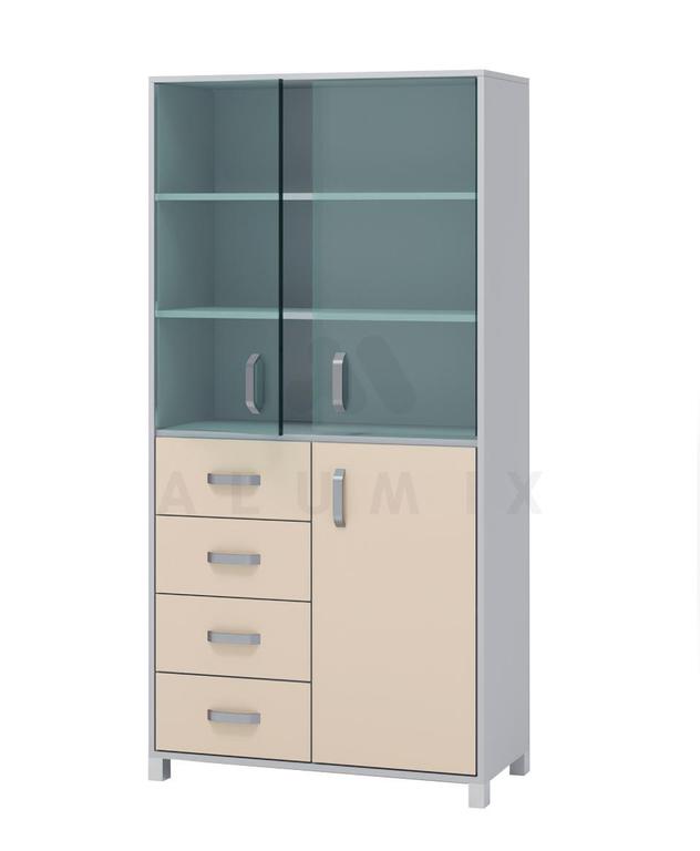 - Оптимальный дизайн: Верхняя секция шкафа оснащена тремя полками и стеклянной дверцей, что помогает быстро сориентироваться в хранящемся в нем материале, поскольку стекло пропускает свет. Нижняя секция имеет как дверцу с полкой, так и удобные выдвижные ящики для хранения мелкогабаритных медицинских принадлежностей.
