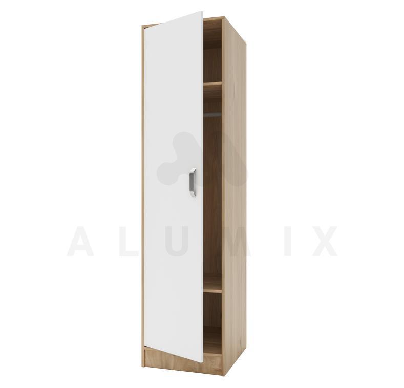 Корпус и фасады одностворчатого шкафа выполнены из ламинированного влагостойкого ДСП, хорошо переносящего обработку дезинфекционными средствами. Корпус обеспечивает надежную и длительную эксплуатацию мебели. Кромка из поливинилхлорида имеет толщину 2 миллиметра. Шкаф укомплектован 2 полками для удобного хранения головных уборов, зонтов, сумок и обуви и штангой для аккуратного развешивания одежды на плечиках. По желанию клиента возможна доукомплектация замком с набором ключей.