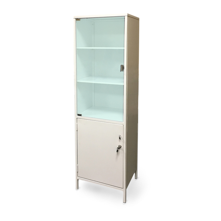 Шкаф изготовлен из высококачественного стального профиля, в котором установлены четыре стеклянные полки для размещения инструмента. Стенки шкафа и полки выполнены из метала, окрашенного белой порошковой краской, дверь - стекло. На двери установлена металлическая ручка, которая в закрытом положении фиксирует дверь при помощи магнита.