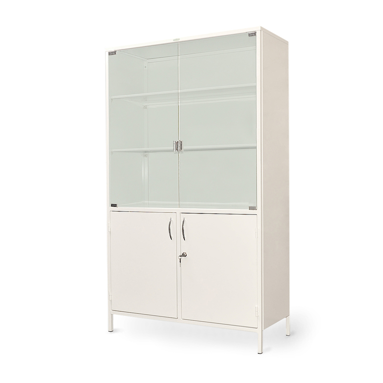 Каркас шкафа двустворчатый изготовлен из металлического профиля и окрашен белой порошковой краской. Нижняя часть выполнена цельнометаллической и запирается на ключ.