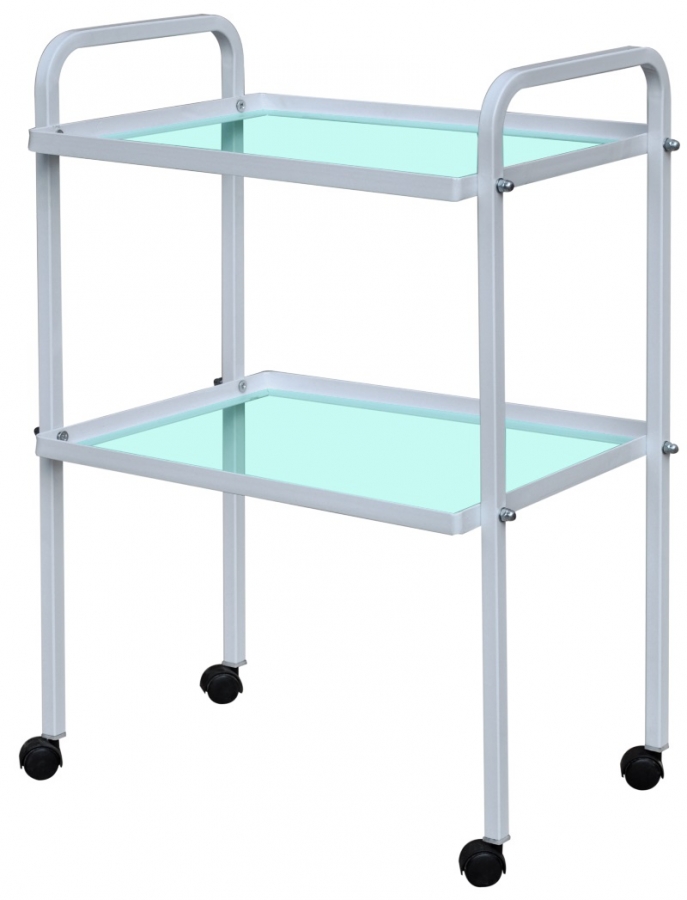 Стол изготовлен из металлического профиля и окрашен порошковой эмалью. Верхняя и нижняя полки изготавливаются из стекла. По требованию заказчика возможно изготовление как металлических.
