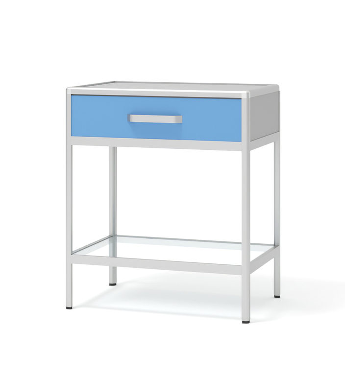 Стол оснащен стеклянной полкой, что позволяет разместить дополнительный или более габаритный медицинский инвентарь. Каркас изделия выполнен из алюминиевого профиля, стенки и фасад выполнены из ламинированного ДСП, столешница с ламинированным покрытием, которое позволяет обрабатывать ее любыми моющими и дезинфицирующими веществами, что очень важно при эксплуатации мебели в помещениях повышенного класса чистоты – процедурных кабинетах, операционных залах, лабораториях и т.д. Стоит отметить, что столик не обладает острыми, выступающими элементами, это предупреждает травмы во время эксплуатации Стол оснащен выдвижным ящиком с возможностью доукомплектации системой плавной доводки при закрывании. В базовой версии стол устанавливается на ножки, но возможна комплектация колесными опорами с тормозами, для фиксации изделия в удобном для врача положении. Цвет фасада и корпуса выбирается по желанию клиента.