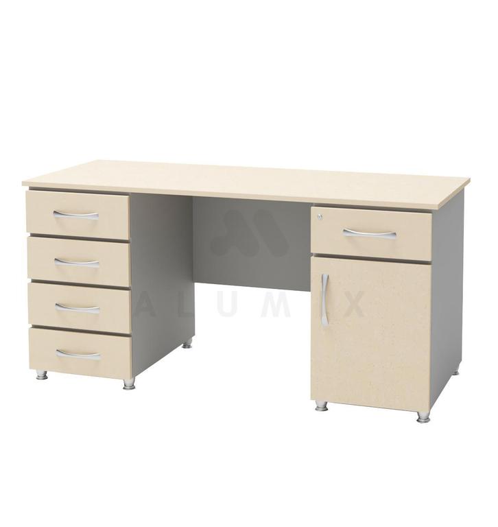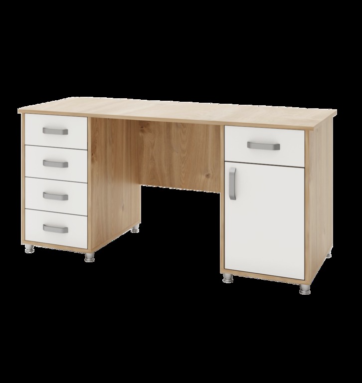 - Максимальная функциональность: Стол оснащен двумя тумбами, обеспечивающими большой объем хранения. Одна из тумб содержит 3 выдвижных ящика, другая – выдвижной ящик и дверцу. Это позволяет легко организовать рабочее пространство и хранить необходимые предметы и документацию под рукой.