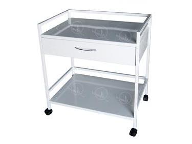Столик манипуляционный СТ-М - предназначен для размещения расходных материалов, медикаментов и инструментов. В верхней части металлического каркаса с полимерным покрытием, установленного на колёсики с тормозами, располагается ящик. Над ящиком и в нижней части каркаса расположены две полки. С трех сторон полки имеют ограждения, верхние из которых одновременно выполняют функцию ручек для перемещения столика.