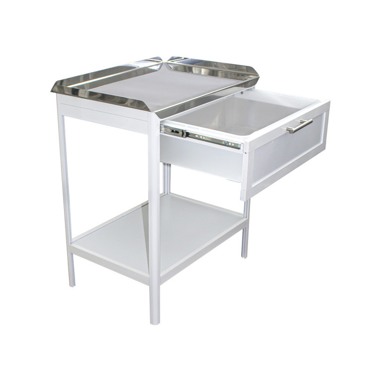 - каркаса изготовленного изготовленного из алюминиевого профиля, имеет столешницу из листа нержавеющей стали размером 645х445 мм с бортиками 30 мм и нижнюю полку из металлокомпозита размером 590х390 мм.