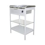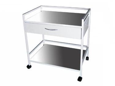 Столик манипуляционный СТ-М-2Н - предназначен для размещения расходных материалов, медикаментов и инструментов. В верхней части металлического каркаса с полимерным покрытием, установленного на колёсики с тормозами, располагается ящик. Над ящиком и в нижней части каркаса расположены две полки, изготовленные из высококачественной полированной нержавеющей стали. С трех сторон полки имеют ограждения, верхние из которых одновременно выполняют функцию ручек для перемещения столика.