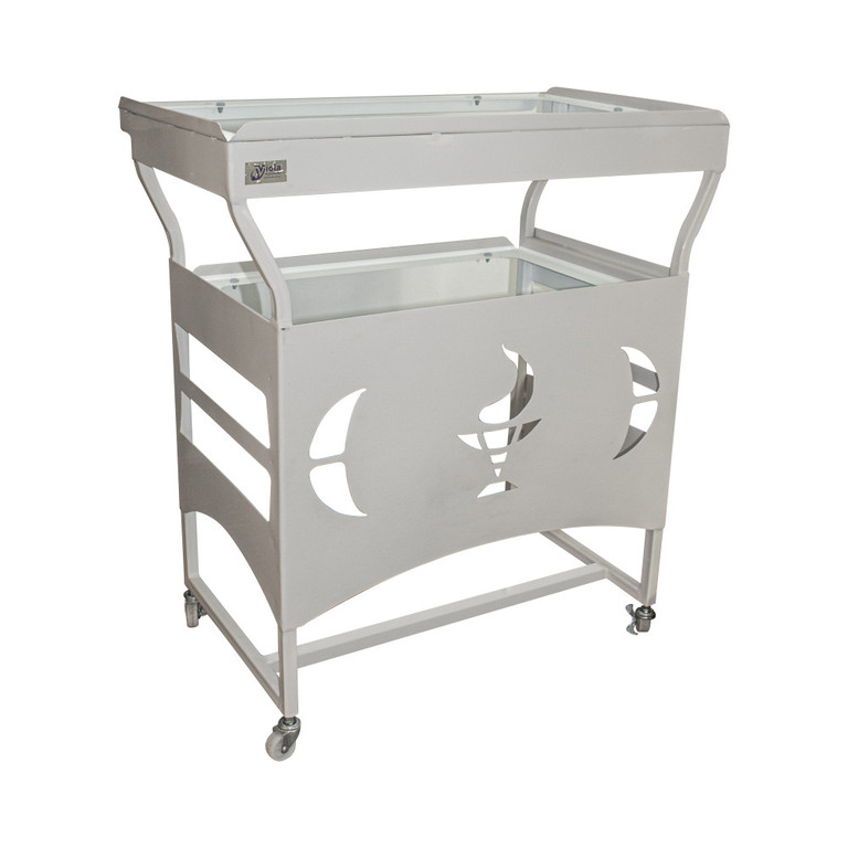 Столики имеют своеобразный дизайн и технологию с учетом эргономики. Конструктивно представляют собой передвижную каркасную конструкцию со стеклянными полочками. Окрашенные металлические поверхности обладают высокой химической стойкостью, что позволяет проводить обработку поверхностей всеми видами дезинфицирующих средств.