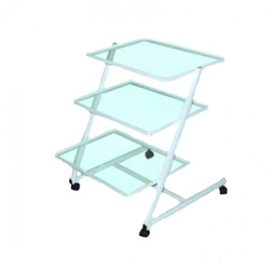 Столик изготовлен из металлического профиля и окрашен порошковой эмалью. Все полки изготовлены из стекла, 4 мм. По требованию заказчика возможно изготовление как металлических так и нержавеющих полок. Стол установлен на сдвоенные пластиковые колёса, что позволяет перемещать его внутри помещения.