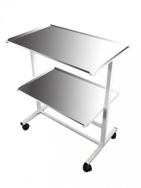 Столик стоматолога СТ-С-2Н - предназначен для размещения расходных материалов, медикаментов и инструментов. Столик выполнен в виде разборного металлического каркаса с полимерным покрытием, установленного на колёсики с тормозами. На каркасе располагаются две съёмные полки, изготовленные из высококачественной полированной нержавеющей стали.