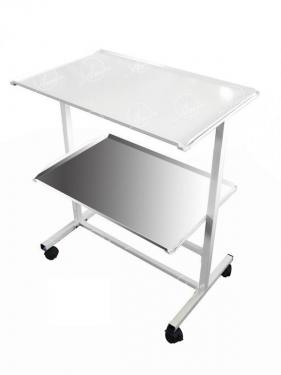 Столик стоматолога СТ-С-МН - предназначен для размещения расходных материалов, медикаментов и инструментов. Столик выполнен в виде разборного металлического каркаса с полимерным покрытием, установленного на колёсики с тормозами. На каркасе располагаются две съёмные полки. Верхняя полка изготовлена из стали с полимерным покрытием, нижняя - из высококачественной полированной нержавеющей стали.
