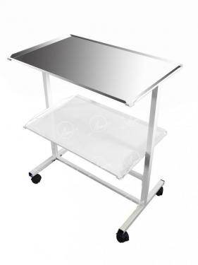 Столик стоматолога СТ-С-НМ - предназначен для размещения расходных материалов, медикаментов и инструментов. Столик выполнен в виде разборного металлического каркаса с полимерным покрытием, установленного на колёсики с тормозами. На каркасе располагаются две съёмные полки. Верхняя полка изготовлена из высококачественной полированной нержавеющей стали, нижняя – из стали с полимерным покрытием.