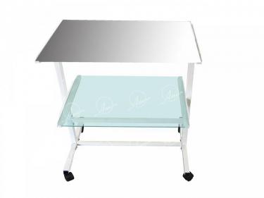 Столик стоматолога СТ-С-НС - предназначен для размещения расходных материалов, медикаментов и инструментов. Столик выполнен в виде разборного металлического каркаса с полимерным покрытием, установленного на колёсики с тормозами. На каркасе располагаются две съёмные полки. Верхняя полка изготовлена из высококачественной полированной нержавеющей стали, нижняя – из стекла с отполированными торцами.