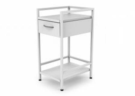 Столик-тумбочка прикроватная СТ-ТП - предназначен для размещения и хранения лекарств, посуды, предметов гигиены и мелких личных вещей больного. Столик-тумбочка выполнен в виде металлического каркаса с полимерным покрытием, установленного на регулируемые ножки. В верхней части каркаса располагается ящик. Над ящиком и в нижней части каркаса расположены полки. С трех сторон полки имеют ограждения.