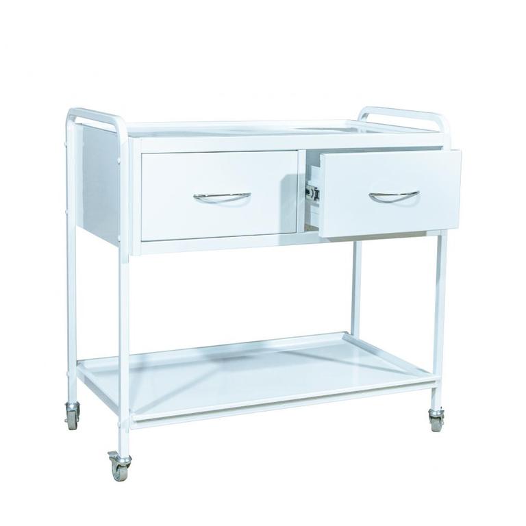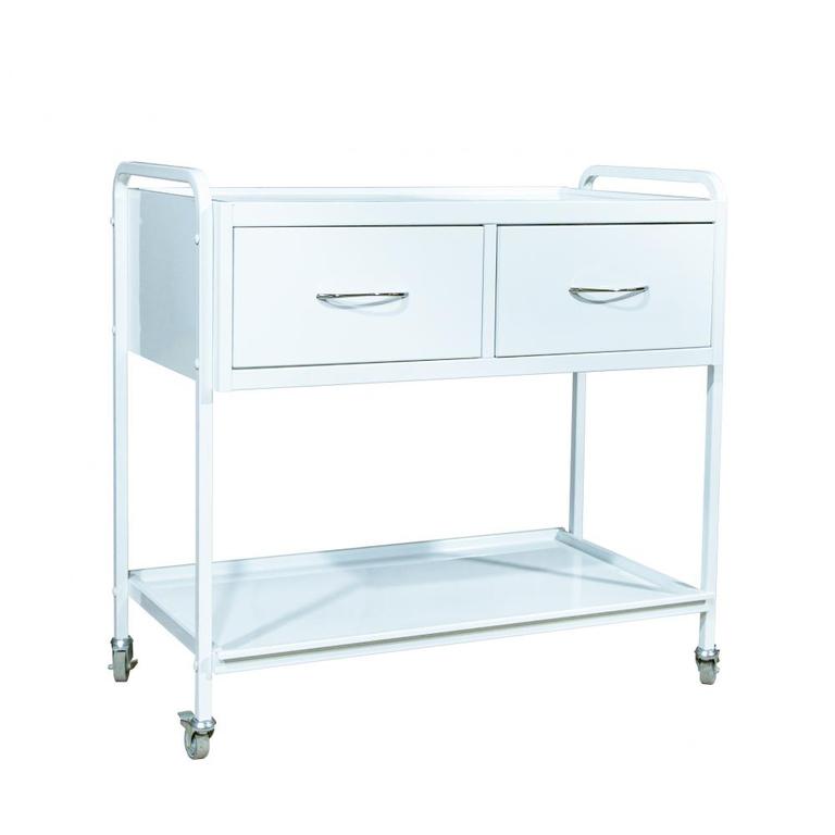 Столик манипуляционный СМ-3Е на 2 ящика предназначен для размещения инструментов и материалов на нем во время различных манипуляций. Столик состоит из металлического каркаса, на который установлены два ящика и две металлические полки, для размещения инструмента. Столик окрашен белой антибактериальной порошковой краской, легко обрабатываемой растворами. Ящики, под заказ, могут окрашиваться в разные цвета. Для удобного перемещения столик оснащен четырьмя колесами (два из которых с тормозами) и имеет удобные ручки над ящиками.