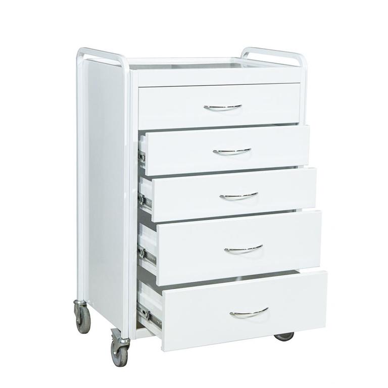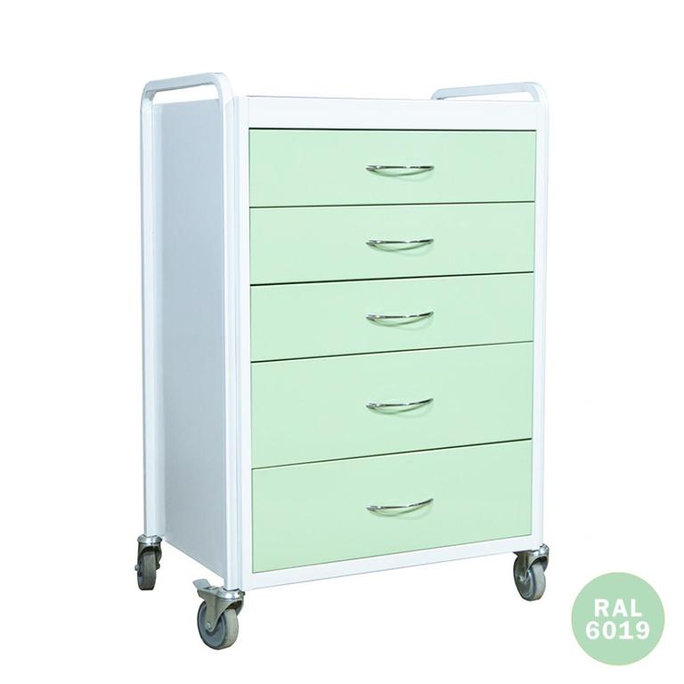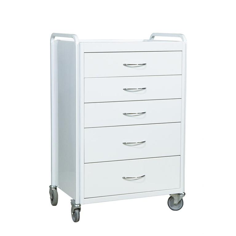 Столик манипуляционный СМ-3Е на 5 ящиков предназначен для размещения инструментов и материалов на нем во время различных манипуляций. Столик состоит из металлического каркаса, на который установлены пять ящиков и одна металлическая полка, для размещения инструмента. Столик окрашен белой антибактериальной порошковой краской, легко обрабатываемой растворами. Ящики, под заказ, могут окрашиваться в разные цвета. Для удобного перемещения столик оснащен четырьмя колесами (два из которых с тормозами) и имеет удобные ручки над ящиками.