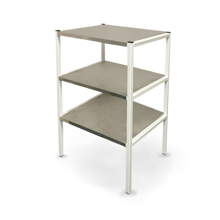 Столик состоит из цельносварного металлического каркаса с полимерным покрытием и расположенных на нём трёх полок, изготовленных из нержавеющей стали.