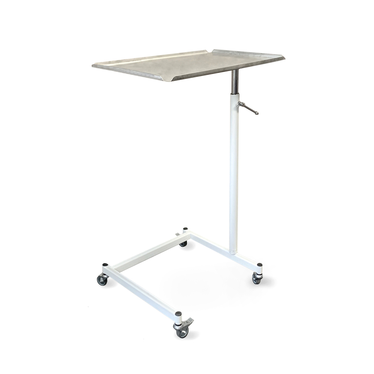 Столик выполнен из металлической профильной трубы, окрашенной белой порошковой краской и установлен на колеса, обеспечивающие его перемещение.
