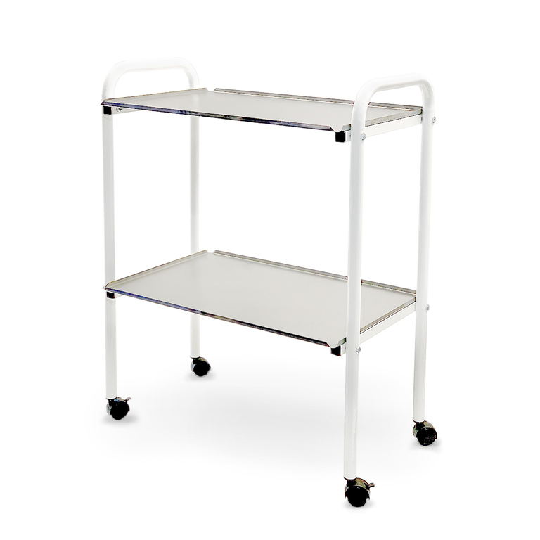 Стол изготовлен из металлического профиля и окрашен белой порошковой краской. Верхняя и нижняя полки изготавливаются из нержавеющей стали .