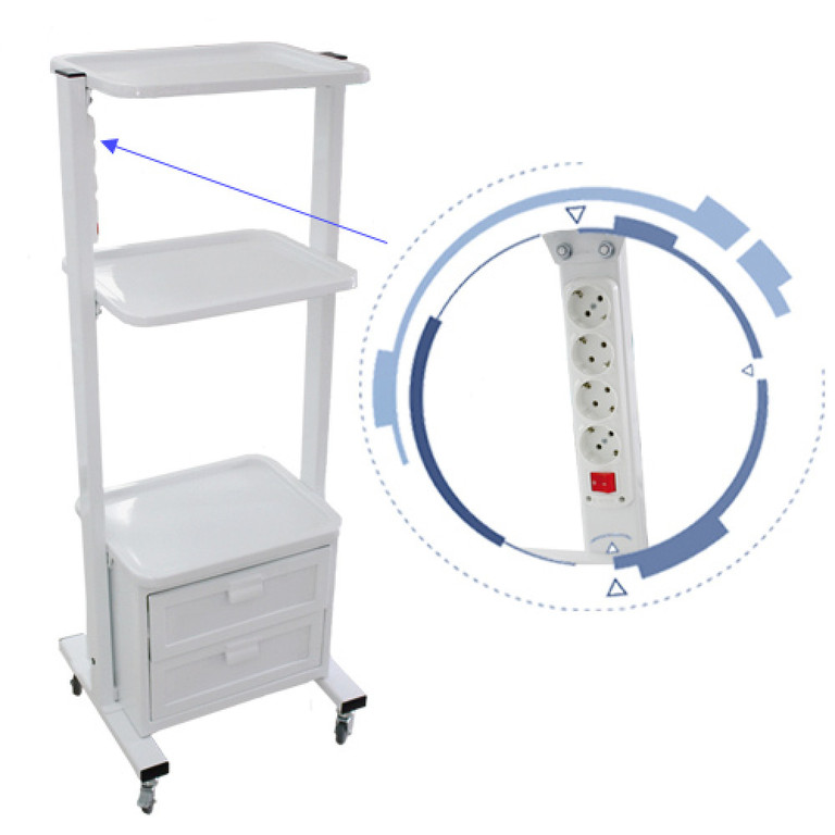 Стойка для приборов СТП-4 имеет сборную металлическую конструкцию. Состоит из трех полок на металлической подложке с пластиковой накладкой с бортиками, которые крепятся к двум стойкам каркаса из металлического профиля. Стойка оснащена блоком из 4-х электрических розеток из сетевого фильтра со шнуром длиной 1,8 м, расположенных между верхними полками. Под нижней полкой расположены два выдвижных пластиковых ящика объёмом 10 л. Двое из четырех колес оснащены тормозом. Металлические части окрашены порошковой краской белого цвета.