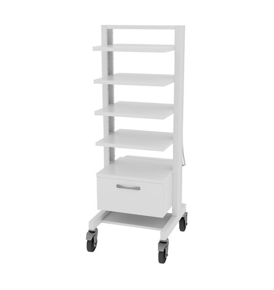 Стойка эндоскопическая СТ-ЭЯ предназначена для размещения на ней приборов, оборудования и расходных материалов. Стойка состоит из разборного металлического каркаса с полимерным покрытием, установленного на четыре колёсные опоры с тормозами. В нижней части каркаса располагается ящик, над которым расположены шесть металлических полок. Расстояние между полками можно изменять с шагом 50 мм. Дополнительно стойка может комплектоваться боковой полкой размером 215х320 мм, кронштейном для эндоскопа, изготовленным из нержавеющей стали. Стойка комплектуется сетевым фильтром.