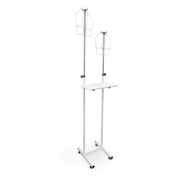 Стойка оснащена двумя выдвижными релингами, на каждом из которых укреплена корзина, состоящая из двух независимых съемных подвесов для флаконов с инфузионными растворами и двух крючков для систем в/в введения.