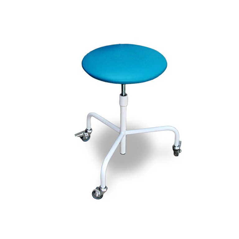 Каркас стула изготовлен из металлического профиля и окрашен белой порошковой эмалью. Сидение стула имеет бесшовную обивку медицинским кожзаменителем. Цвет обивки выбирается по желанию заказчика. Высота стула регулируется с помощью винтового приспособления. Вращением сидения по или против часовой стрелки достигается соответственно опускание или подъем сидения. Стул установлен на три колеса.