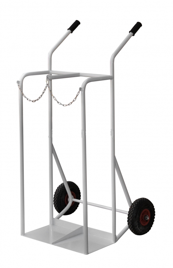Тележка предназначена для перевозки баллонов до 50 литров, оснащена защитным ремнями предотвращающие падение баллона. Тележка установлена на два резиновые колеса.