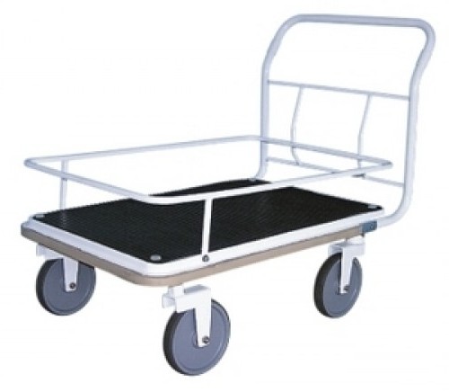 Применяется в медицинских учреждениях. Каркас тележки изготовлен из металлического профиля и окрашен белой порошковой эмалью. Платформа тележки установлена на четыре резиновые колеса и имеет защитные ограждения.