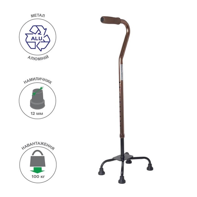 Трость Ridni Опора KJT934А с четырьмя опорами изготовлена из легкого металла алюминия и окрашена в бронзовый цвет. Является индивидуальным средством реабилитации и передвижения при нарушении функций нижних конечностей для: