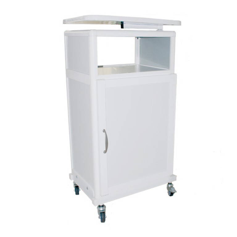 Над столешницей тумбочка оборудована подвижной полочкой из пластика на металлической основе (размер 460/360 мм) с возможностью поворота на 180° и регулировки по высоте. Под столешницей, для удобства пользования, тумбочка имеет нишу. Внутри тумбочка оборудована полочкой. Вся конструкция размещается на 4-х самоориентирующихся колесах два, из которых, с тормозной системой, что обеспечивает изделию мобильность.