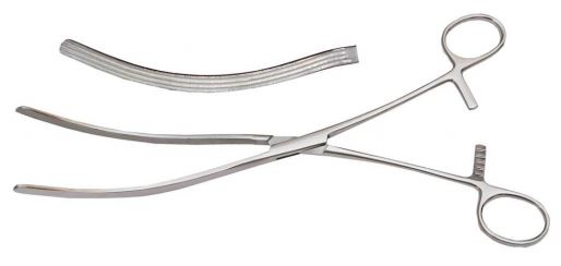 Зажим кишечный эластичный для взрослых, изогнутый, 235 мм. Длина рабочей части 110 мм. Инструмент предназначен для сдавливания стенок кишки и желудка.