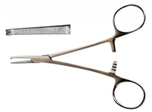 Зажим Кохер, одно - и двузубый, зубчатый, прямой, 150 мм, № 1. Кровоостанавливающий зажим Кохера имеет зубцы на конце. При смыкании один зуб входит в промежуток между двумя зубцами, обеспечивая прочную фиксацию на конце сосуда. Длина рабочей части 25